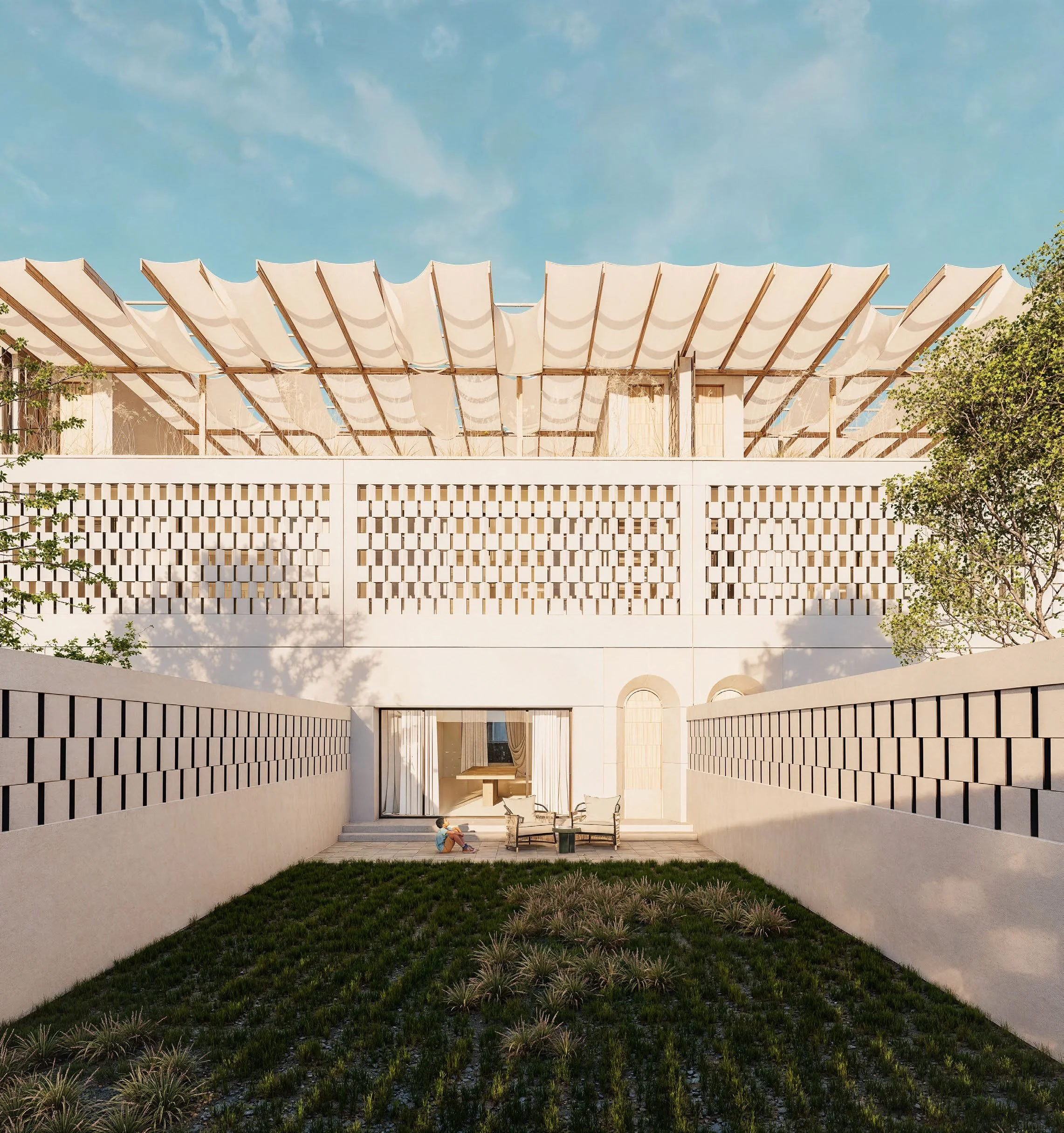 Sustainability forms an integral part of the overall concept. The project employs environmentally conscious materials—locally sourced and low in embodied carbon—while passive design strategies enhance energy efficiency. Building forms naturally contribute to thermal comfort: overhanging elements in the villas and deep loggias in the apartment buildings help reduce solar gain.