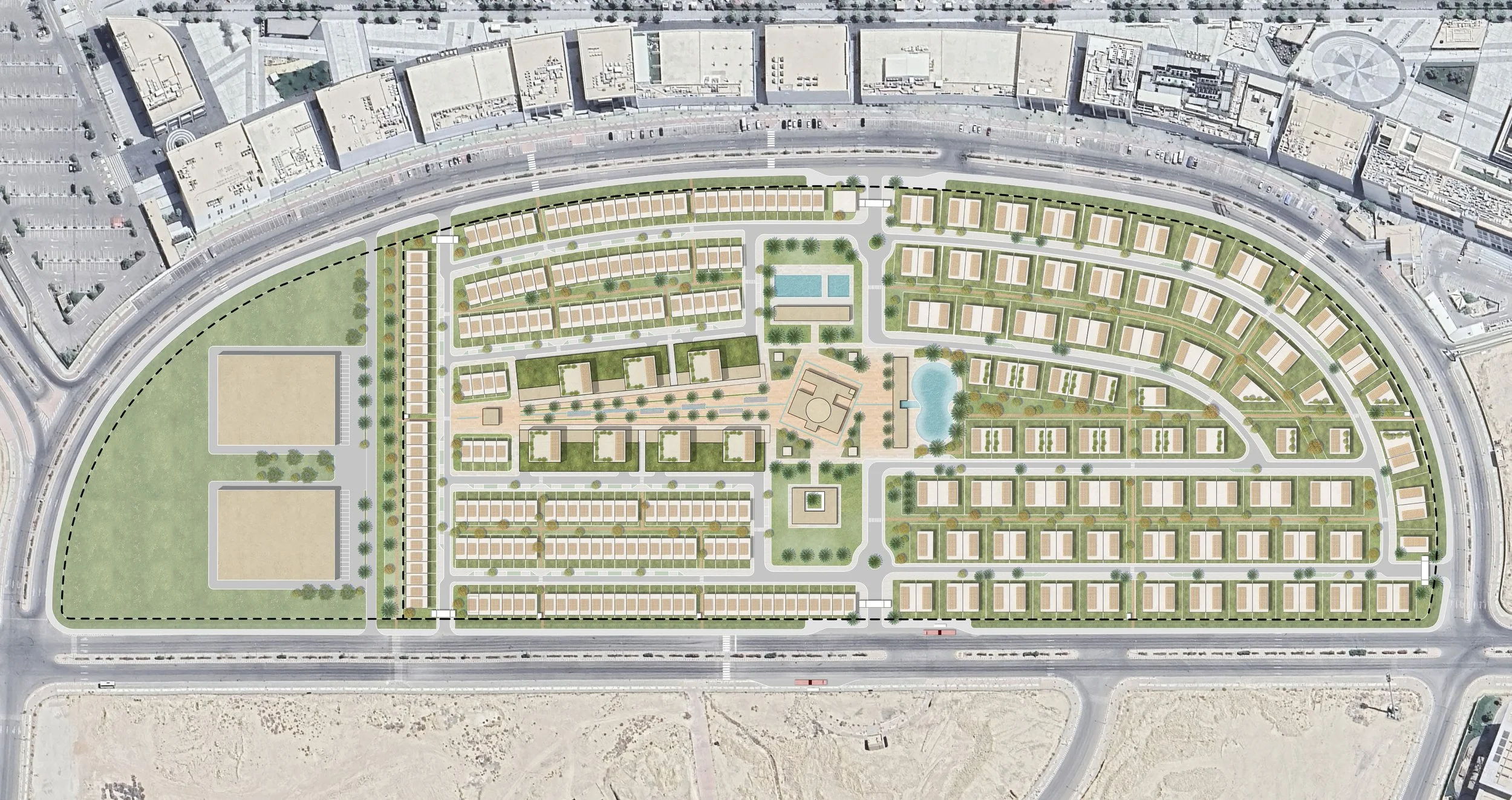 Ezdihar is strategically located in Riyadh, just a short distance from King Saud University, making it one of the most sought-after areas for residential living. Its prime location ensures excellent connectivity to key educational, cultural, and commercial hubs of the city, offering residents both convenience and a high quality of life. The development spans a total of 120,000 sqm of gross floor area (GFA) and is designed to accommodate a diverse range of residential typologies, including villas, townhouses, and apartment blocks. The project is complemented by a comprehensive set of residential amenities, thoughtfully integrated to serve the needs of the community. The master plan is carefully designed to respect the natural configuration of the site, creating a central hub that anchors the tallest buildings and key communal areas. From this core, the residential buildings are organized along a series of concentric alleys and boulevards, promoting a sense of order and connectivity while encouraging pedestrian-friendly movement throughout the neighborhood. This layout not only enhances the aesthetic appeal but also fosters a strong sense of community by creating open spaces, green corridors, and social interaction points at multiple scales. Special attention has been given to the balance between density and livability. By placing taller buildings at the center and gradually reducing heights towards the perimeter, the design maximizes views, sunlight, and ventilation while minimizing visual impact. The arrangement of streets, boulevards, and alleys ensures smooth traffic circulation and easy access to all amenities, making the development highly functional as well as visually harmonious. In essence, Ezdihar offers a complete residential environment that combines modern living, social engagement, and seamless integration with its surroundings. It is not just a place to live, but a thoughtfully planned community that enhances lifestyle, convenience, and well-being for all its residents.